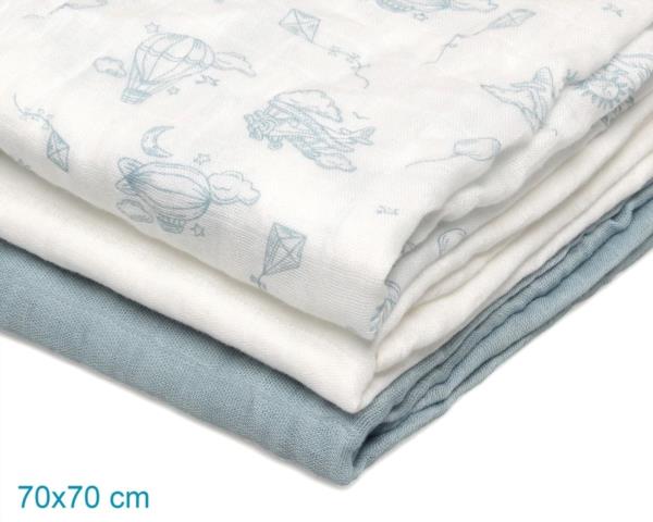 SET DE 3 MUSELINAS AZUL, BLANCO Y ESTAMPADO DE AVIONES 70X70CM